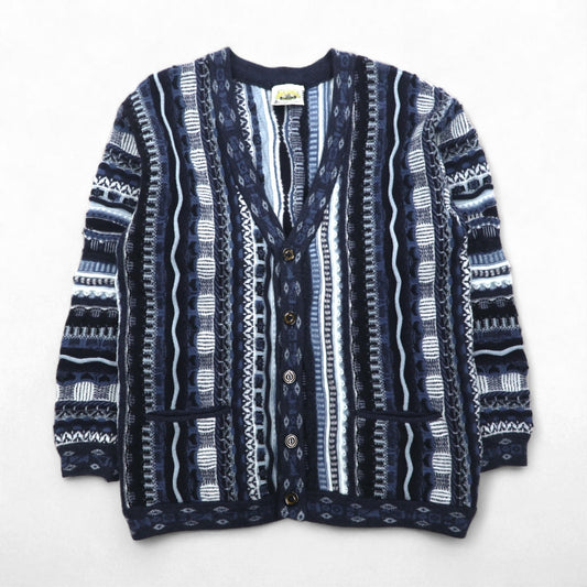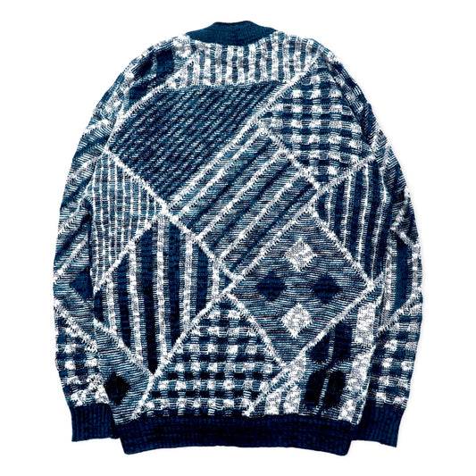 90s Italy Vintage Cardigan COLORE 90年代 ジャガード カーディガン 3D ニット XL ネイビー