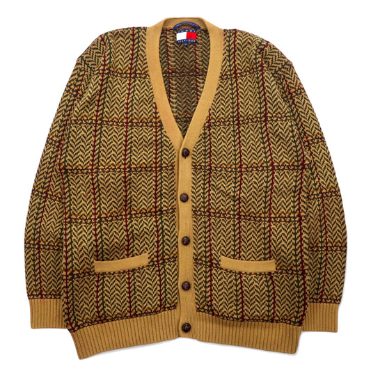 TOMMY HILFIGER 90年代 コットンニット カーディガン XL ブラウン チェック くるみボタン レザー エルボーパッチ