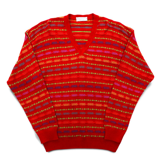 Fantasie di Settembre イタリア製 90年代 Vネック 3D ニット セーター L レッド 総柄 ボーダー