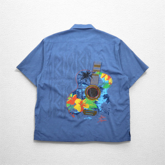 Hard Rock CAFE 半袖 オープンカラーシャツ 開襟 アロハシャツ XL ネイビー レーヨン 刺繍 ギターモチーフ 刺子