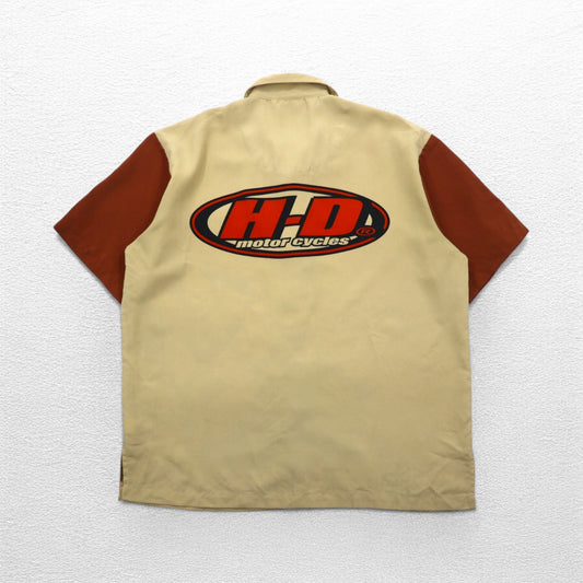 HARLEY DAVIDSON モーターサイクル グラフィック 開襟 半袖 オープンカラーシャツ XL ベージュ バックロゴ