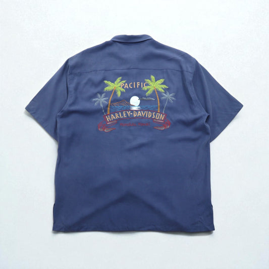 HARLEY DAVIDSON 開襟 シルク オープンカラー 半袖シャツ アロハシャツ XL ネイビー ハワイアン刺繍
