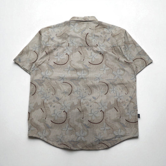 Columbia アロハシャツ 総柄 半袖シャツ L ベージュ ハイビスカス フィッシング 魚 FM7086