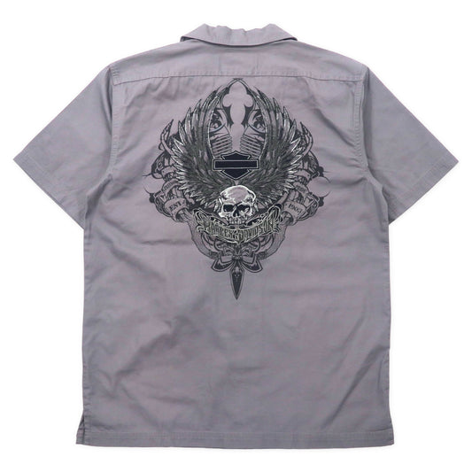 HARLEY DAVIDSON 半袖 オープンカラー ワークシャツ S グレー コットン バックロゴ刺繍