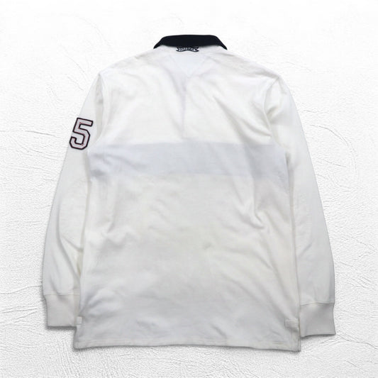TOMMY HILFIGER RIBBLINE RUGBY SHIRT L WHITE COTTON NUMBERING VINTAGE FIT