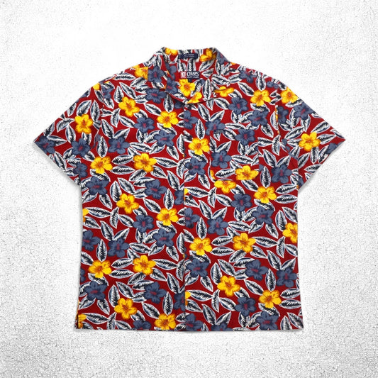 CHAPS RALPH LAUREN 90s Aloha Shirt L Red Cotton All-over Hibiscus Chest Pocket