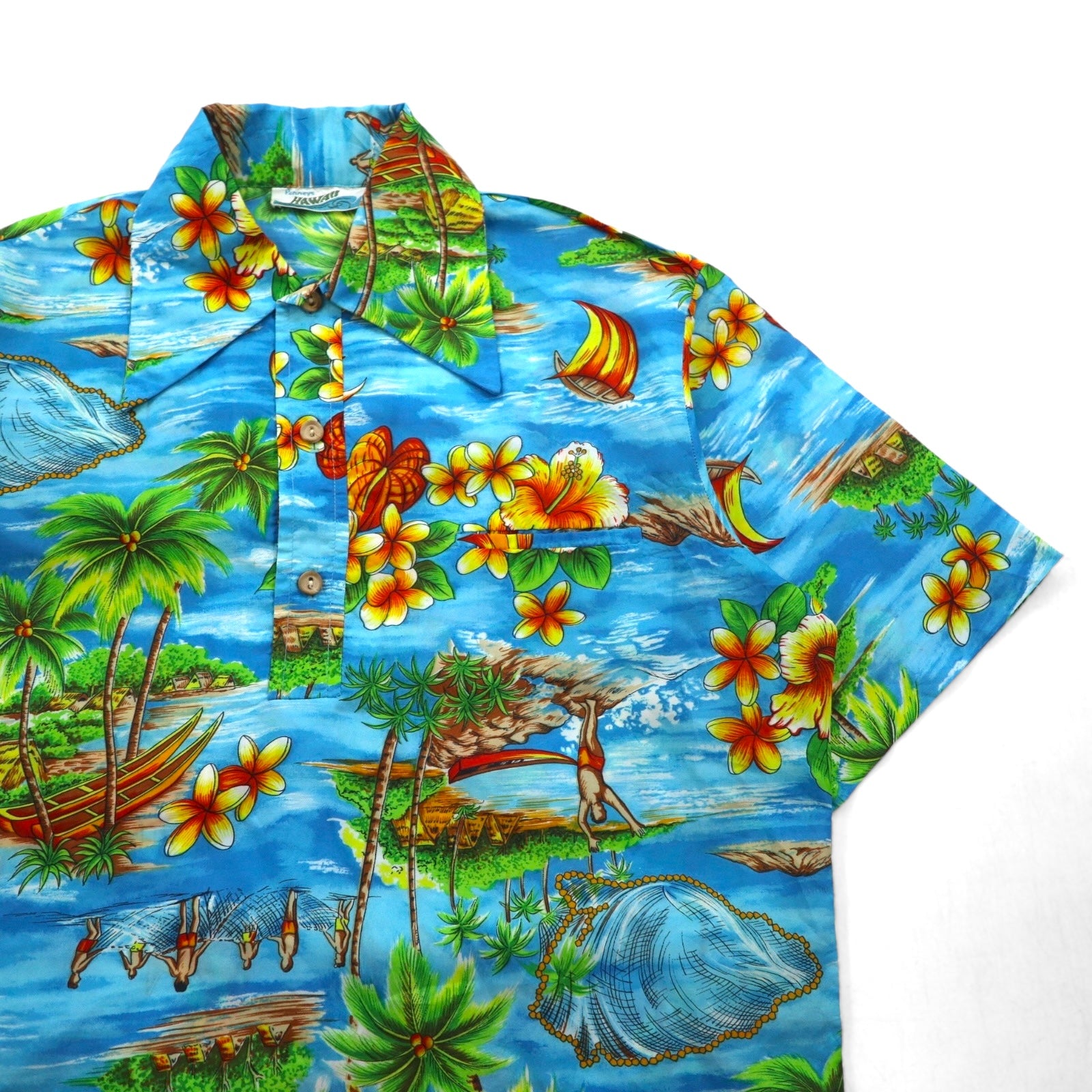 Pennys Hawaii 70s Pullover Aloha Shirt, Size L, Blue, Polyester, Collar, All-Over Print, Beach