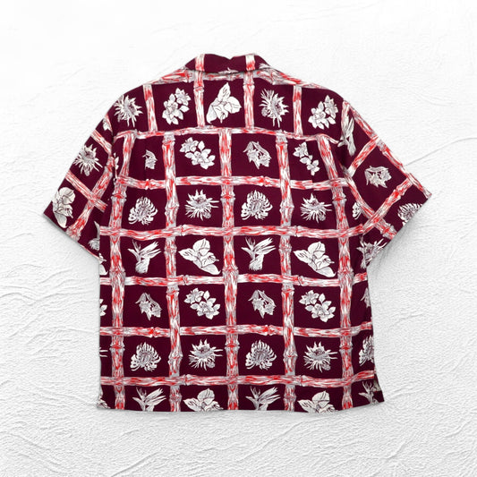 Navy Flag open collar aloha shirt, M, burgundy, rayon, all-over pattern, hibiscus