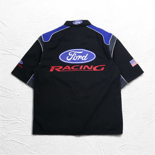 Ford by JEFF HAMILTON Short Sleeve Racing Shirt L Black Snap Button Double Sided Print