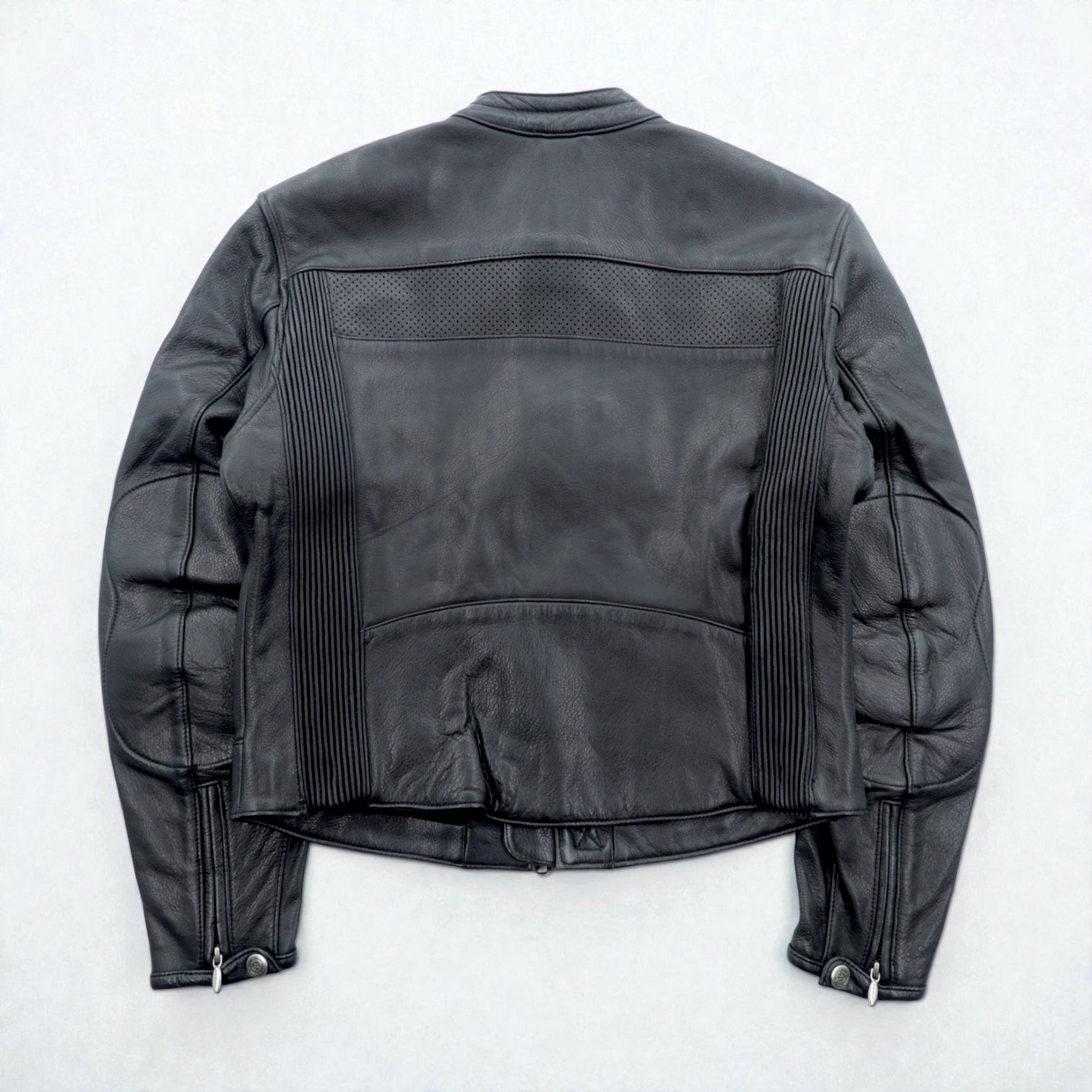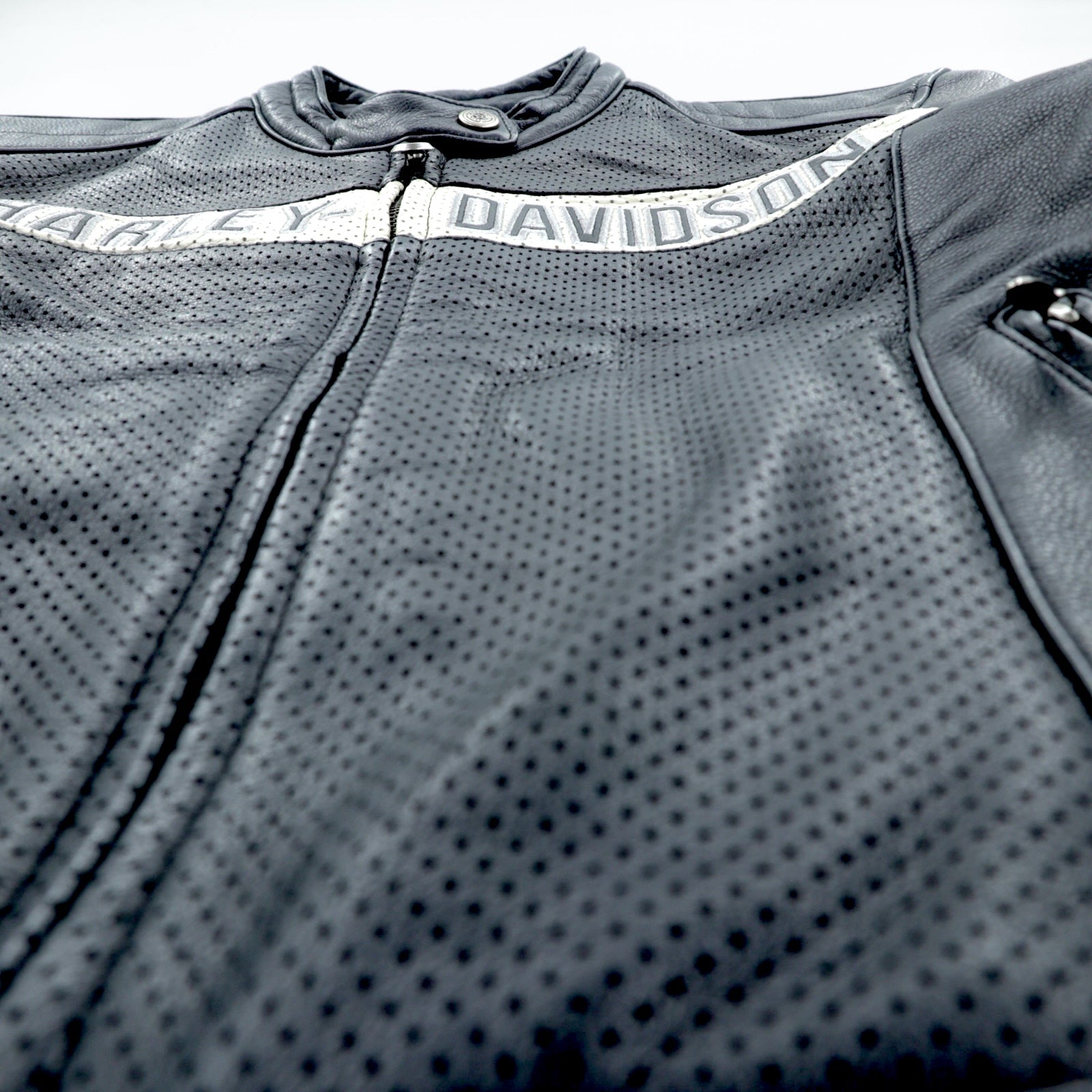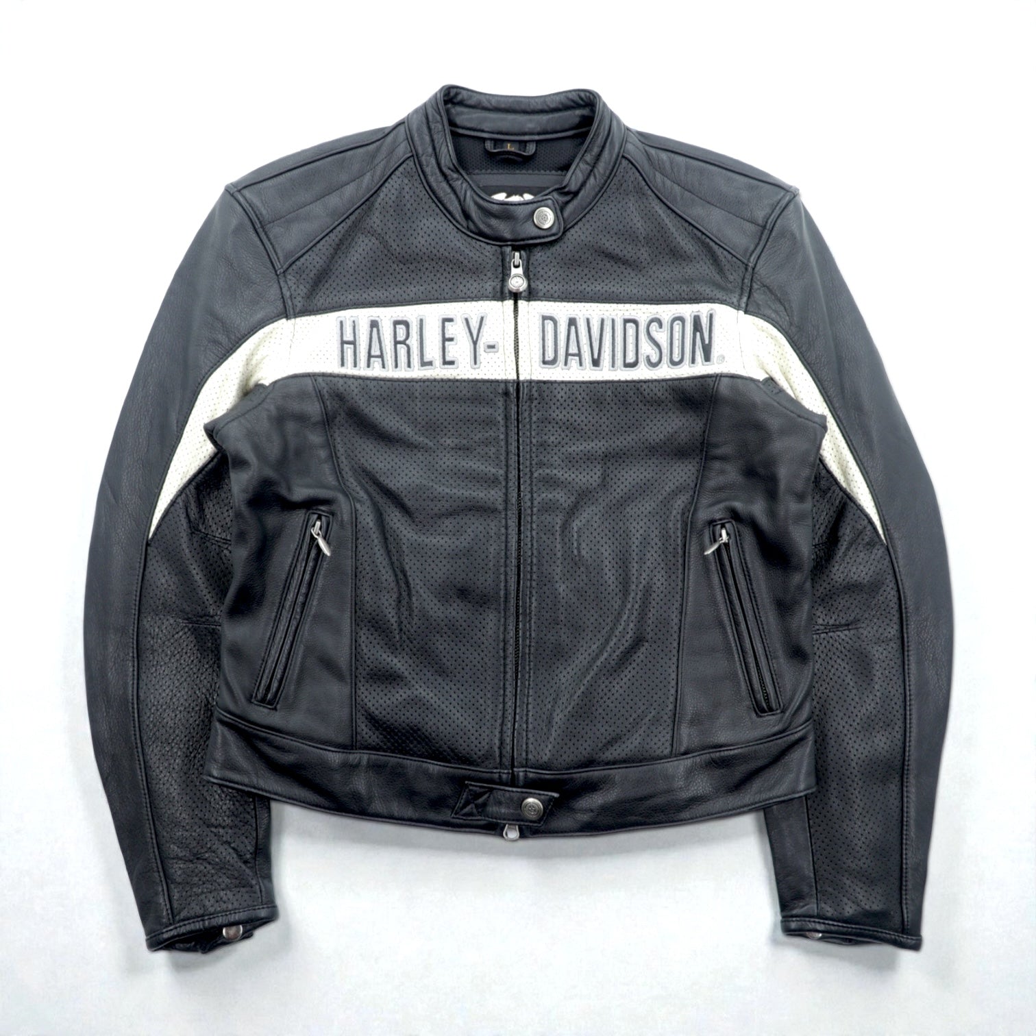HARLEY DAVIDSON パンチングレザー レーシングジャケット L シングルライダース ダブルジップ 白ライン