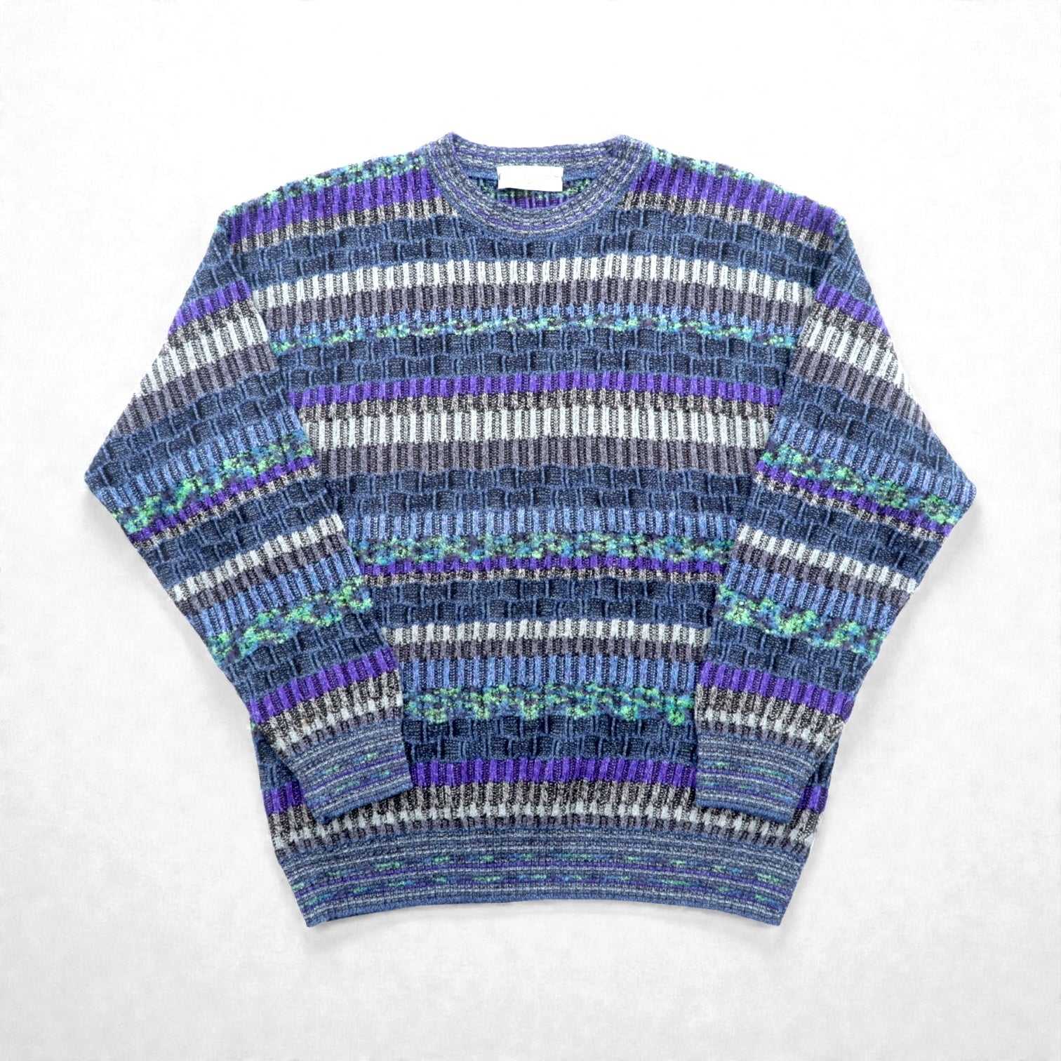 FANTASIE DI SETTEMBRE 90年代 イタリア製 ジャガード ニット セーター L ブルー ウール 総柄 ボーダー