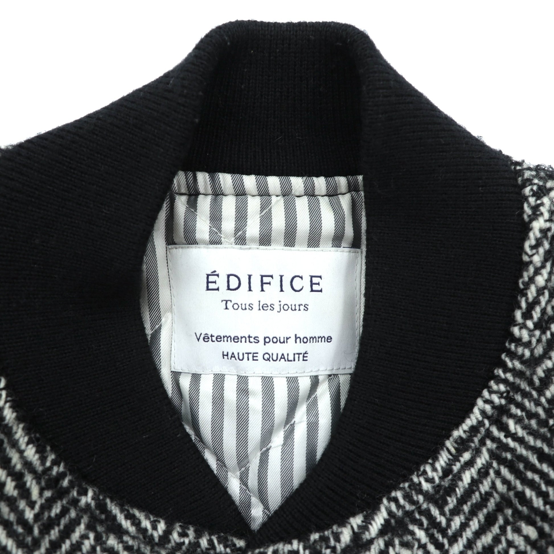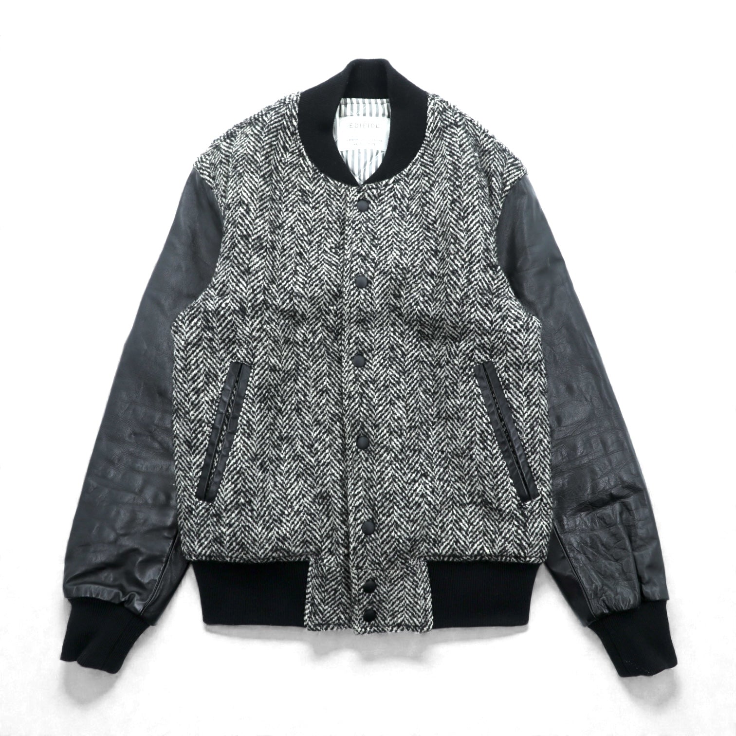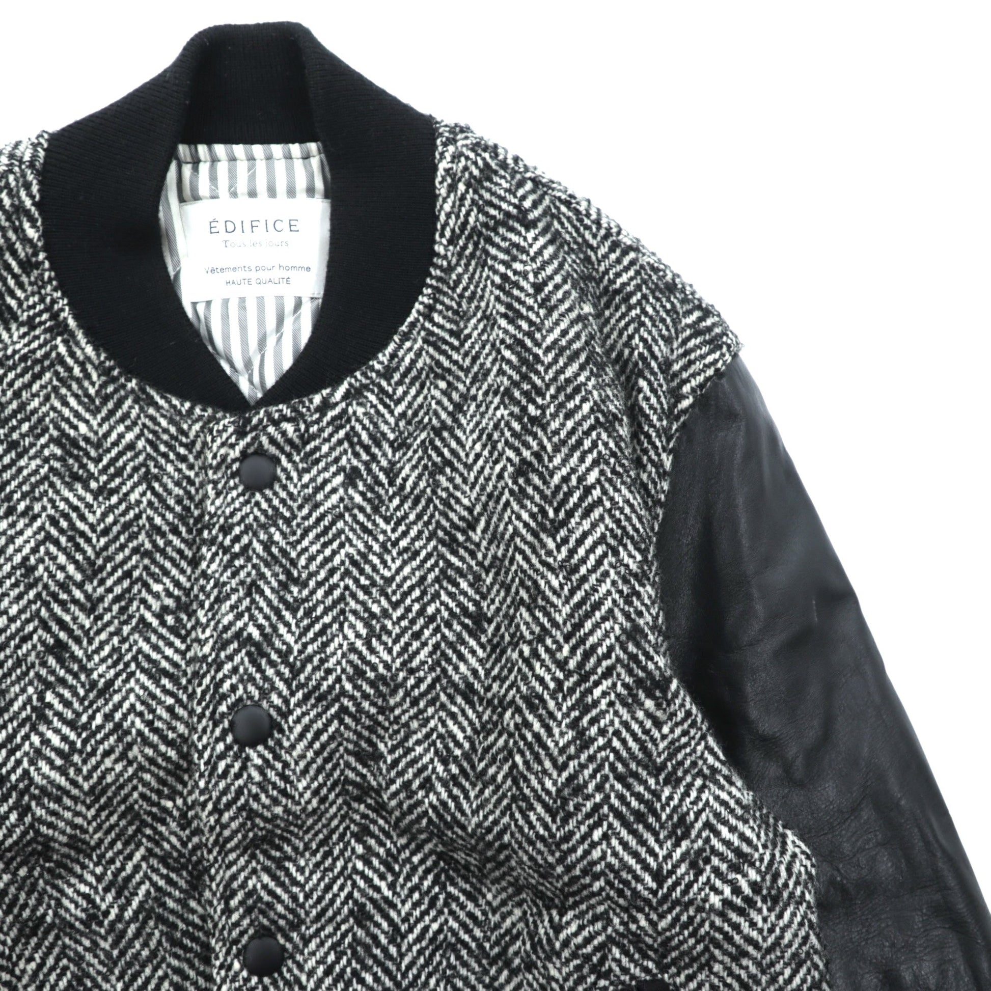 EDIFICE 袖レザー切替 スタジャン S ブラック ウール ヘリンボーン 牛革