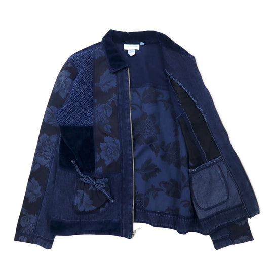 MARSHA SPORT USA製 パッチワーク 異素材切り替えデザイン ジップアップジャケット M ネイビー コットン ベロア デニム 花柄