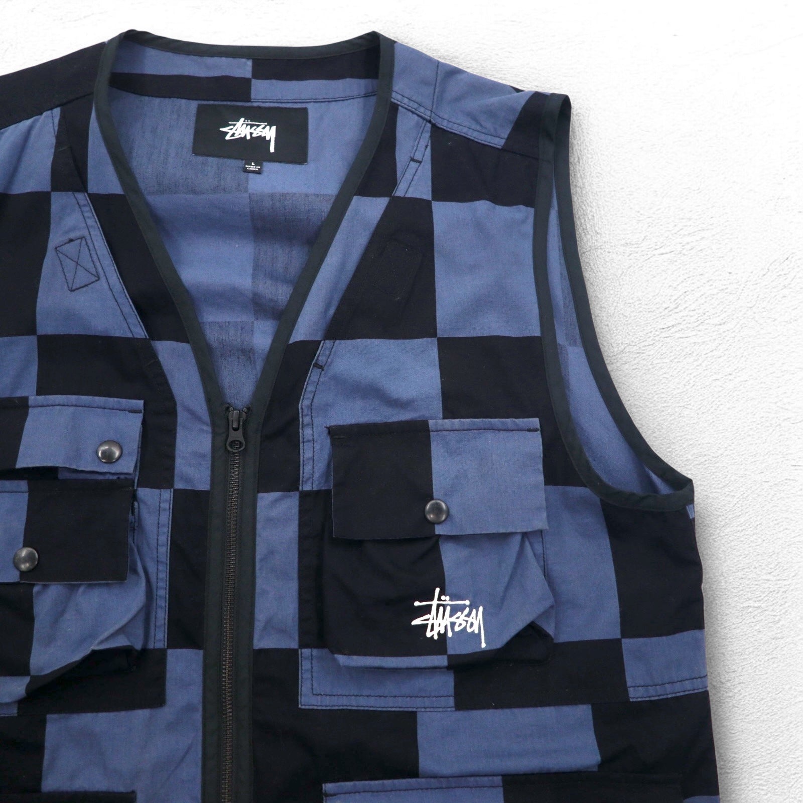 stussy ユーティリティベスト L ブラック ブルー チェック チェッカーフラッグ コットン