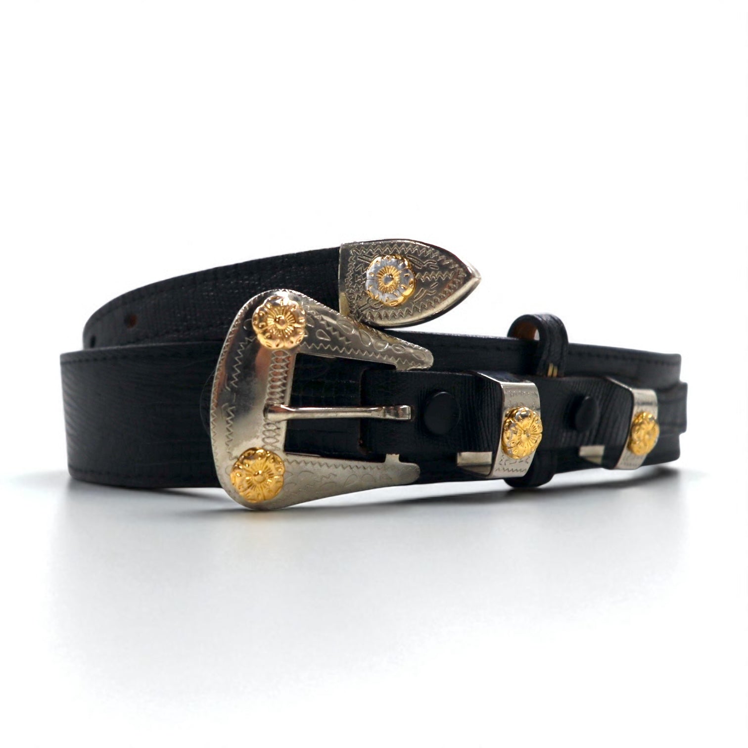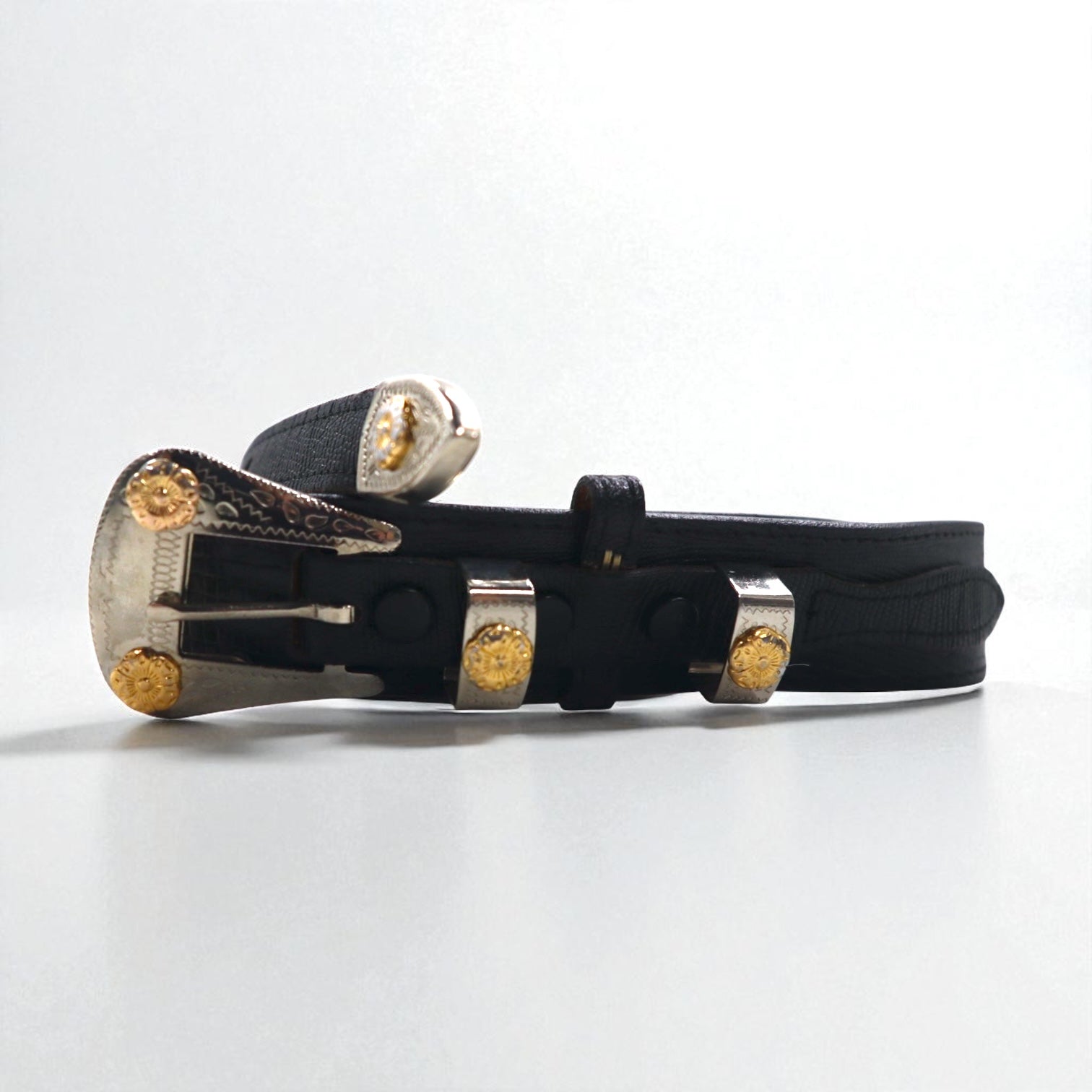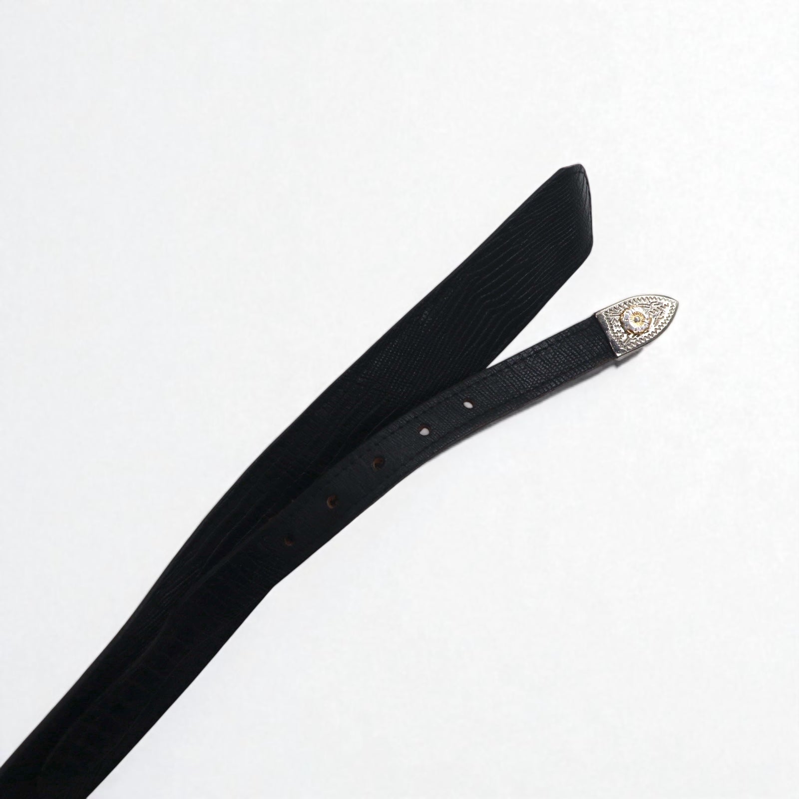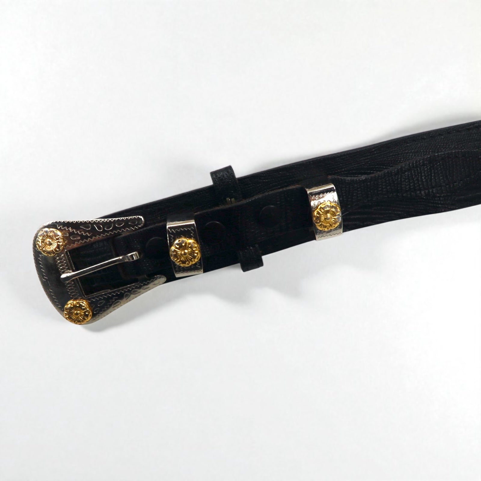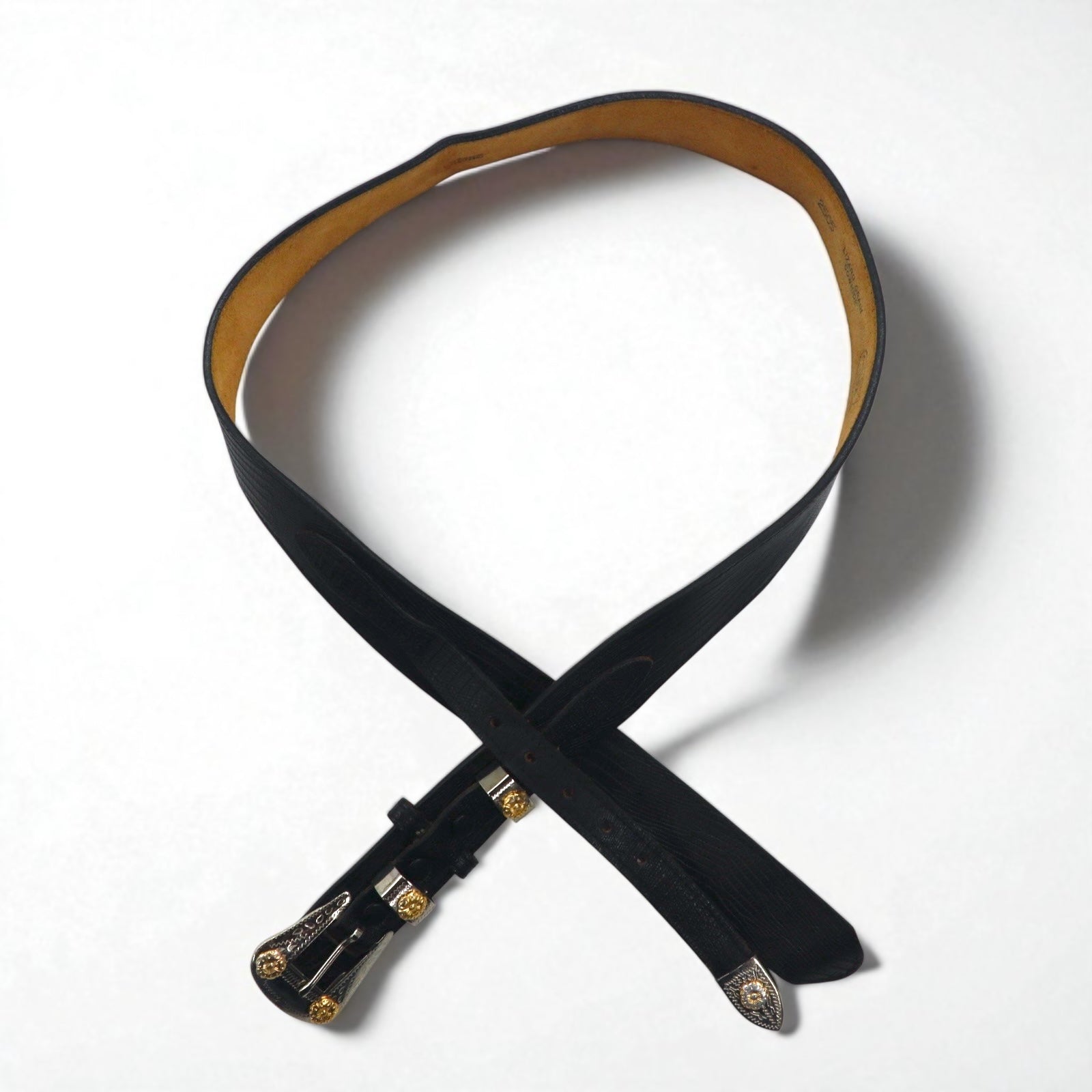 Lyntone USA製 リザード型押し レザー ウエスタンベルト 38 ブラック 牛革 シルバー ゴールド バックル