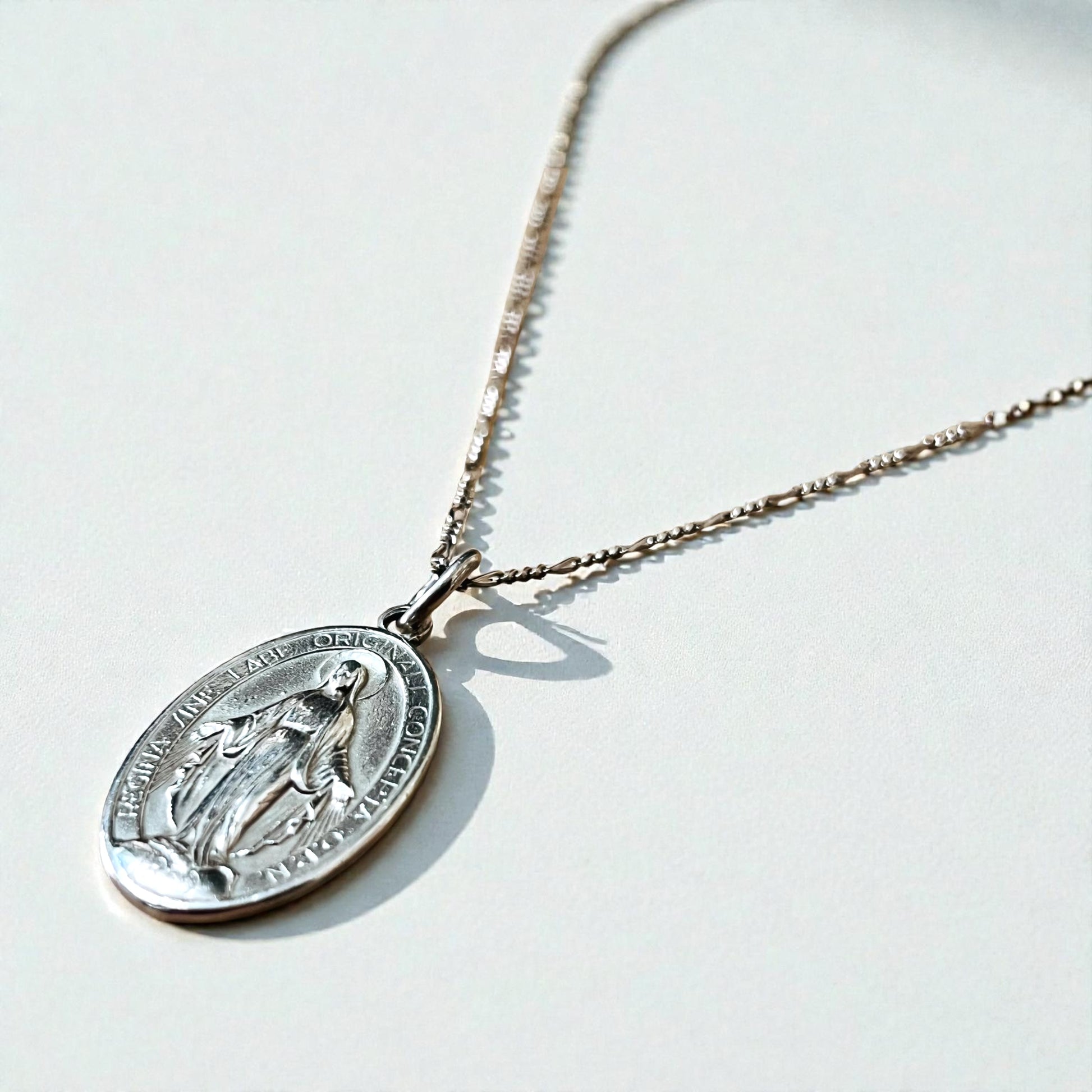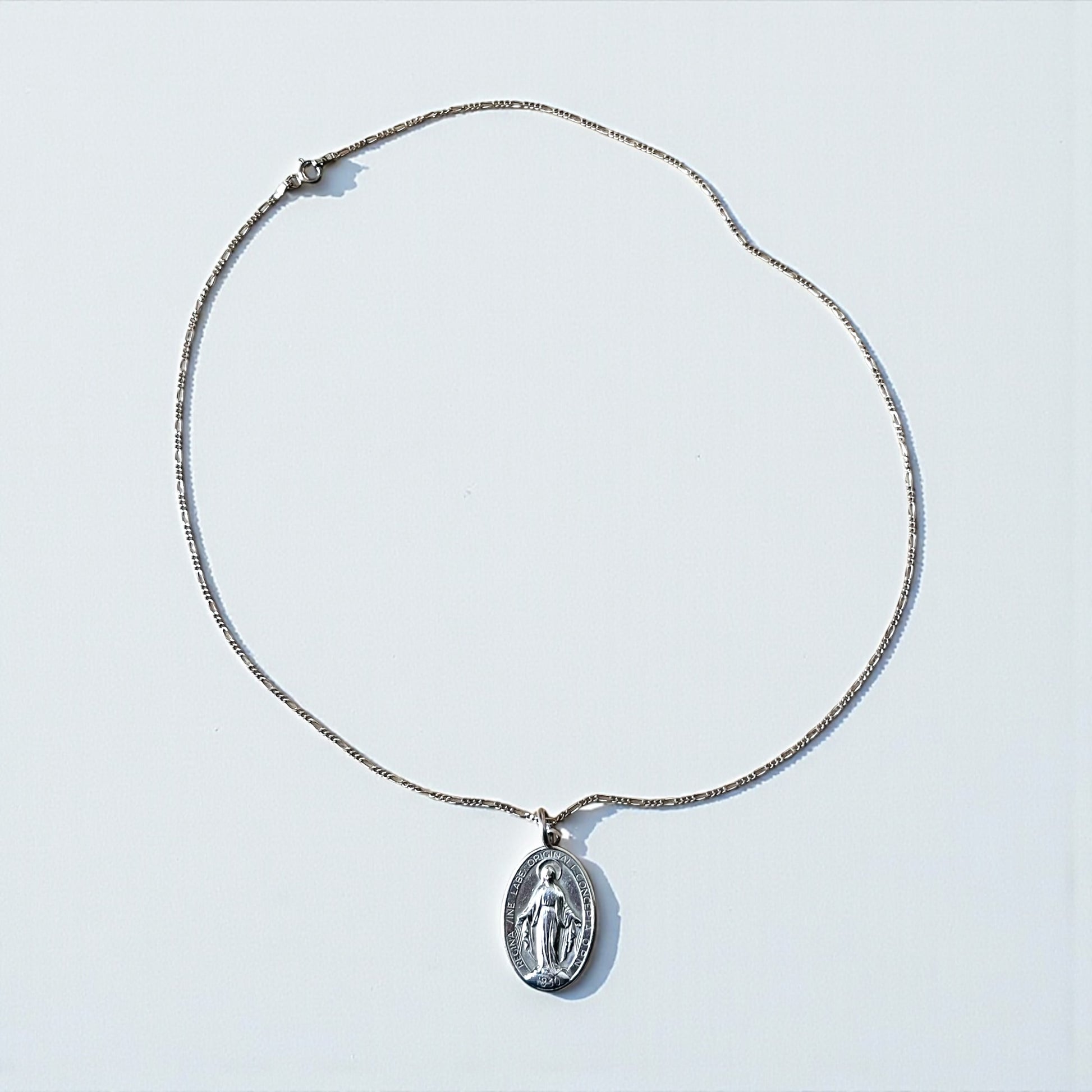 Italy Vintage Miraculous Medal Virgin Mary Necklace 聖母マリア オーバルコイン ネックレス シルバー 925 フィガロチェーン
